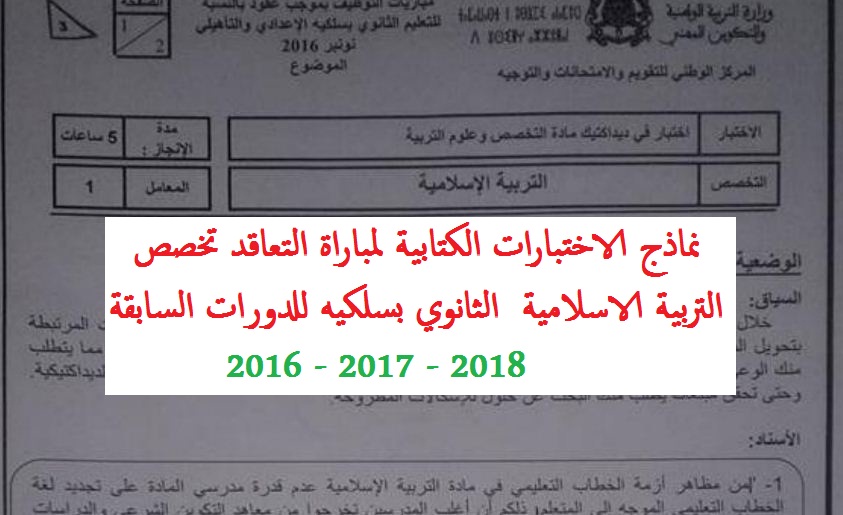نماذج الاختبارات الكتابية لمباراة التعاقد تخصص التربية الاسلامية الثانوي بسلكيه 2016 2017 2018