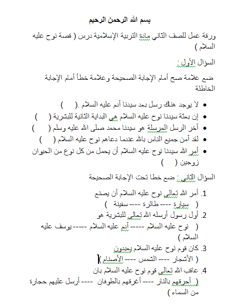 ورقة عمل درس قصة نوح عليه السلام للصف الثاني تربية اسلامية الفصل الاول